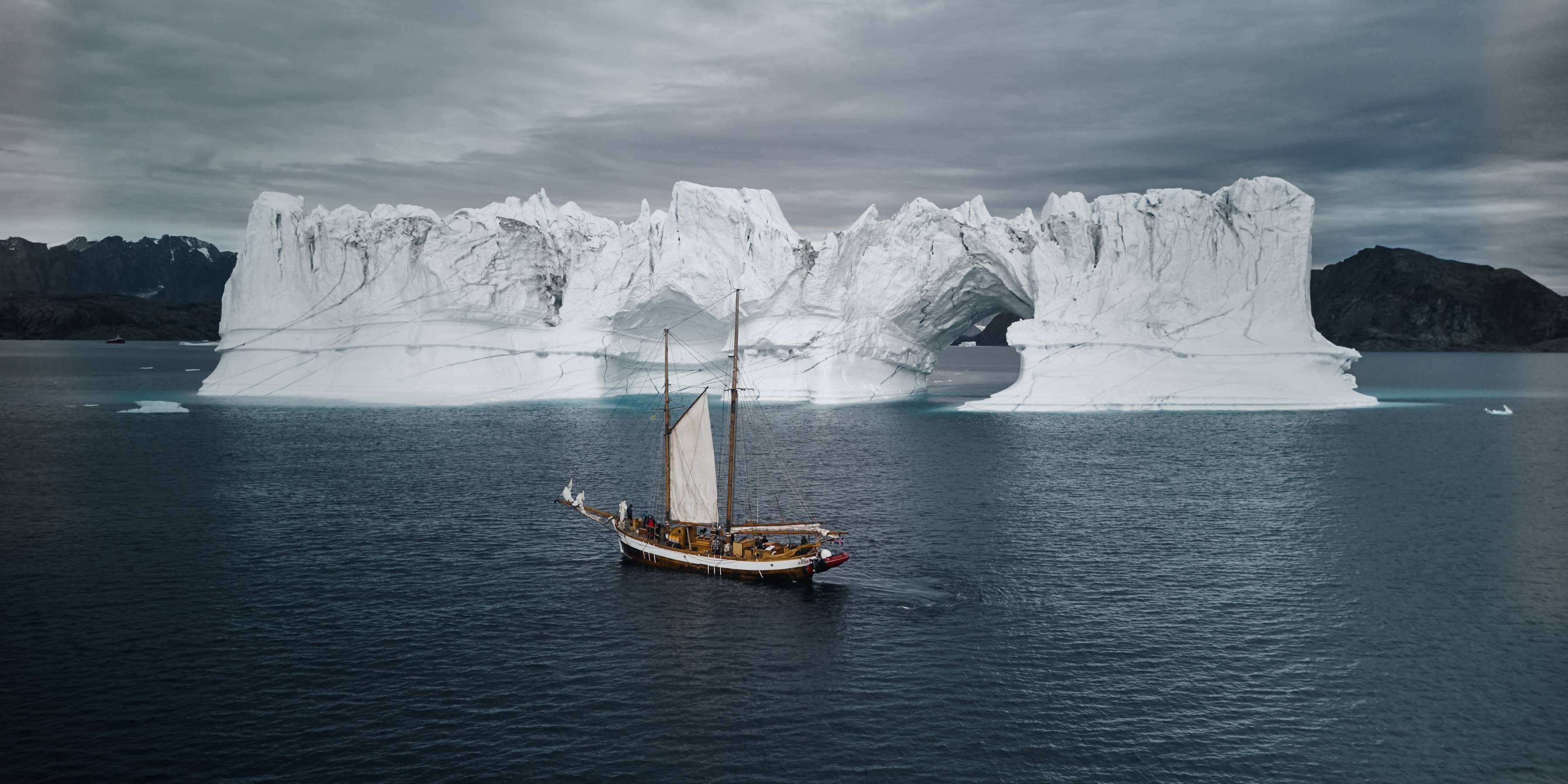 Das kleine Holzboot, umgeben von Eisbergen, war eine Woche lang unser Zuhause. Acht Teilnehmer und vier Crewmitglieder.